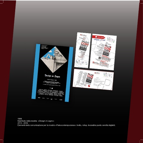 1989 Manifesto della mostra «Design in Legno». 2013 - 2014 Elementi della comunicazione per la mostra «Paleocontemporanea»: invito, rollup, locandina punto vendita biglietti.